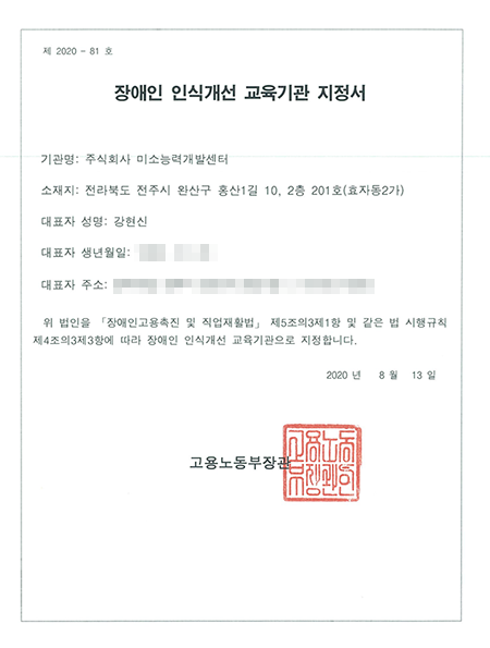미라클 자격증센터가 장애인인식개선교육기관으로 지정되었습니다!!