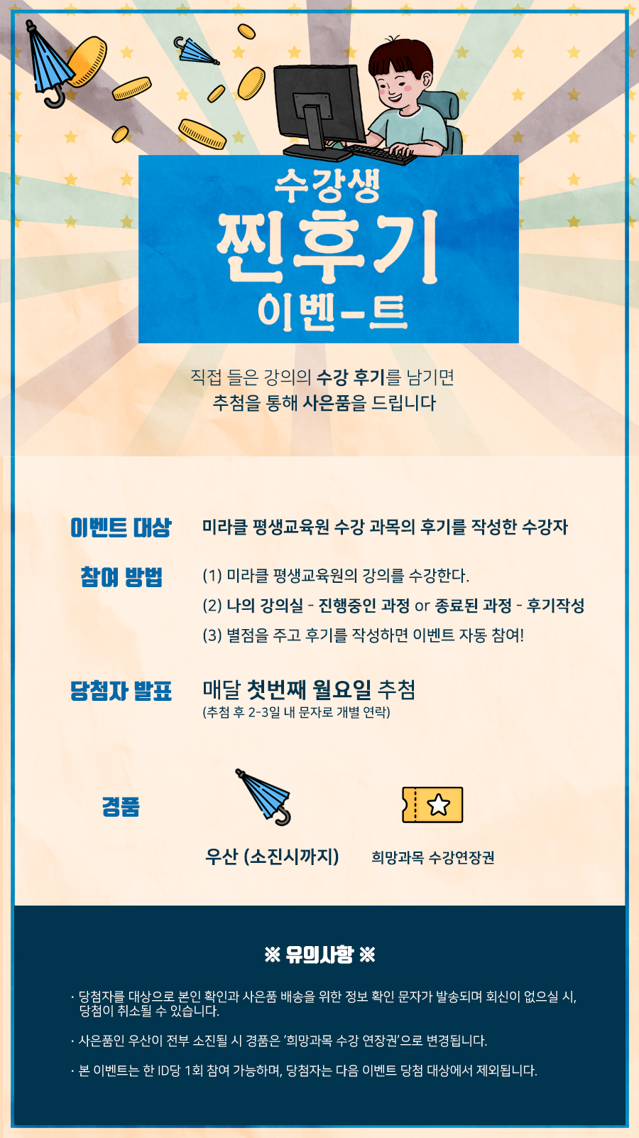 미라클 평생교육원에서 수강 후기를 작성한 수강생들을 대상으로 이벤트를 진행합니다.