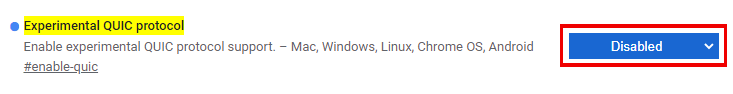 크롬으로 교육 진행 시 동영상 강의 끊김 현상 또는 버퍼링이 지속될 때 크롬 웹 브라우저 주소 입력창에 " chrome://flags/#enable-quic " 을 입력하세요. 그러면 Experimental QUIC protocol(실험적 QUIC 프로토콜)이란 항목이 선택됩니다.