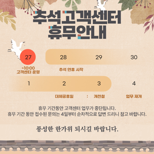 2023년 추석 연휴로 인해 고객센터 업무가 중단됩니다.