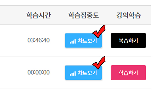 학습 데이터가 쌓이면 ‘차트보기’ 버튼을 클릭하여 시간당 강의 집중도를 확인 가능합니다.